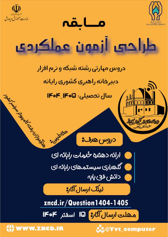 در راستای ارتقای کیفی آموزش و اهمیت ارزشیابی شایستگیمحور در فرآیند یادگیری مهارتها، مسابقه "طراحی آزمونهای عملکردی دروس مهارتی رشته شبکه و نرمافزار رایانه"،